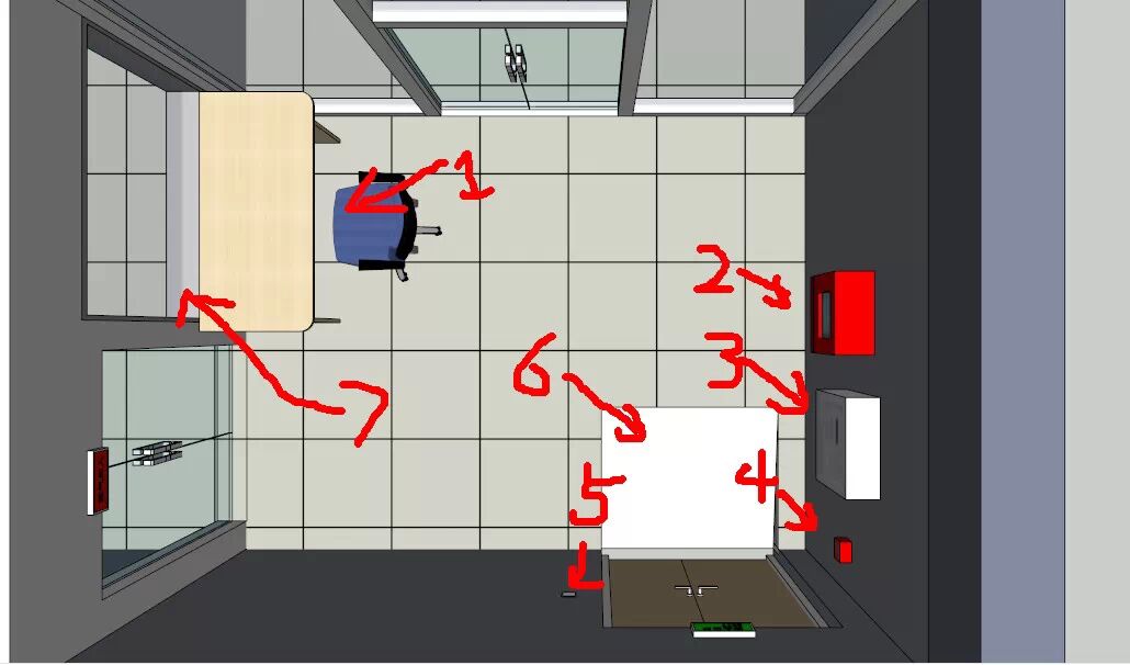1、监控桌子,也用来日常简单检修;2、消防控制器;3、消防控制器;4、消防紧急启停按钮;5、门禁开关;6、斜坡;7、观察窗。这里要说的是,我们选用的出入控制系统是和消防系统有联动的,一旦消防报警,会输出告警信息给出入控制主机,强制开启门禁直到消除告警或手动重启主机。之所以把消防启停按钮放这里是因为考虑到人员出现紧急情况而设备不告警时或者设备误告警时都可就近紧急处置。