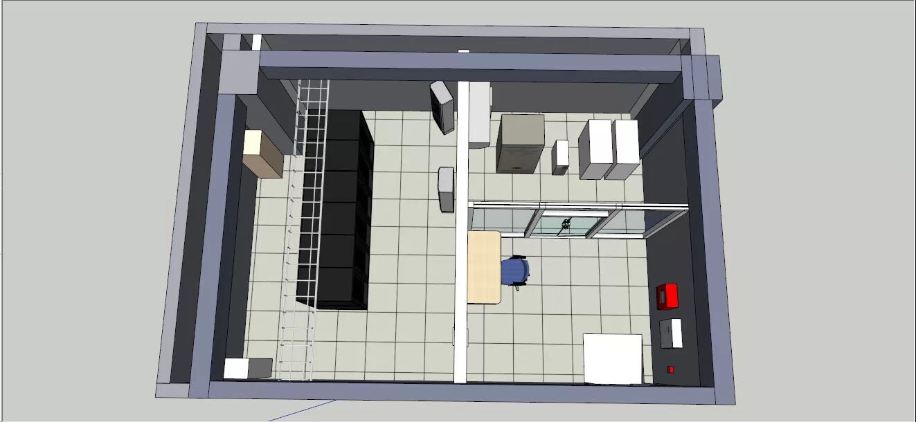 在2900mm可利用的高度下,我将机房分为:主机防区、供配电区、缓冲监视区、底下地板空间等等,占比分别是1/2,1/4,1/4,利用供配电区的大梁承重,免了电池承重不足的先天忧虑,也留有充分的管理人员配电操作空间及设备运输安装空间。而缓冲监视区主要承担设备搬运准备,人员日常巡查,领导参观介绍,普通设备检修及进入机房的准备工作,换鞋、泄放静电等等。主机防区就完全由IT设施构成,配以空调、消防、新风排风设备、电力、网络等等,构建一个地盘不大但是五脏俱全的机房空间。