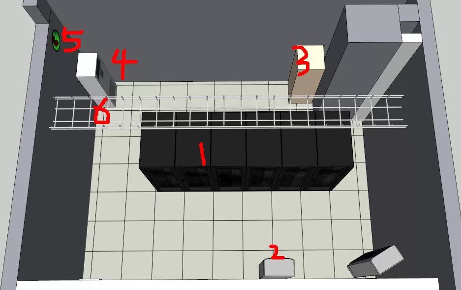 1、主机柜,能够放置六台标准机柜;2、后备民用空调,虽然不建议,但是既然客户预算有限只能考虑搬原来机房两台过来使。3、消防气瓶;4、柜式新风机(带预处理功能,避免换入过热或过冷的空气形成水雾;5、排烟轴流风机;6、网格走线桥架。