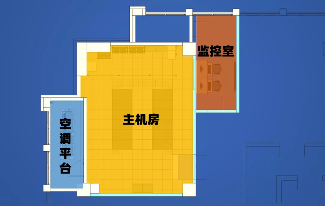 通过隔断装饰,将机房划分为监控室、主机房、空调平台等三个大空间,互相之间完全的物理隔离,所设墙体由地面水泥完成面直通天花板底。