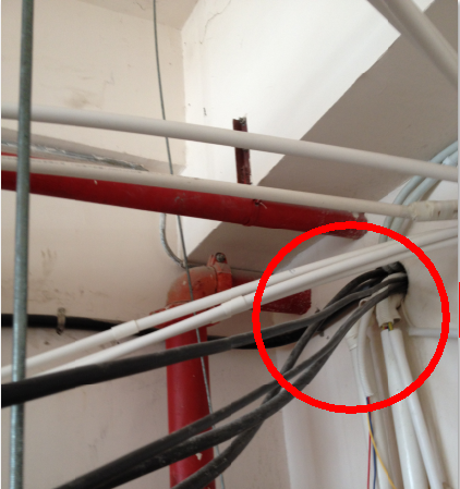 上面这张图是我在一个用户单位现场的吊顶上方拍下来的真实图片,图中可以看到,该穿管的电缆直接穿进去了,该做护套端接处理的地方直接裸露电缆了,该做防火封堵的地方也完全没有做封堵,机房外部如果发生电缆着火,那百分之一千会蔓延到这个区域,里面如果放着机电设备就改烧的烧该毁的毁了。